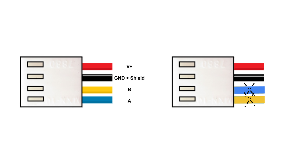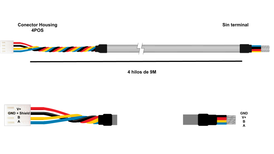 C) Corroborar que la malla del blindaje del cable bus esté aterrizada al hilo negro (GND) del cable. Esta unión se genera para que la malla de blindaje que envuelve todo el cable aterrice el ruido eléctrico al hilo de tierra (GND), esta conexión se genera de fábrica para todos los cables con blindaje del extremo donde se coloca el housing 4POS, se determina no colocarlo en extremo libre ya que el cliente puede recortar el cable si no se adapta al tamaño de su instalación.