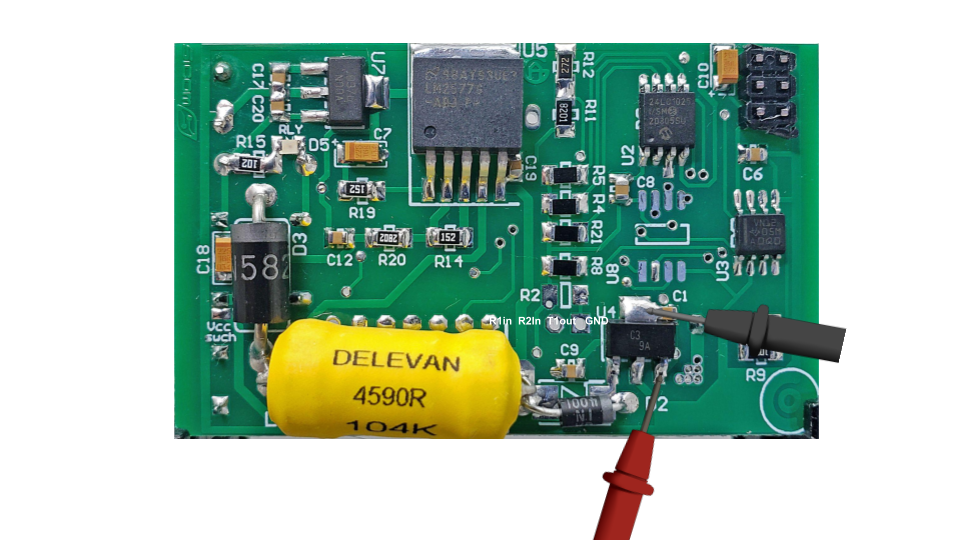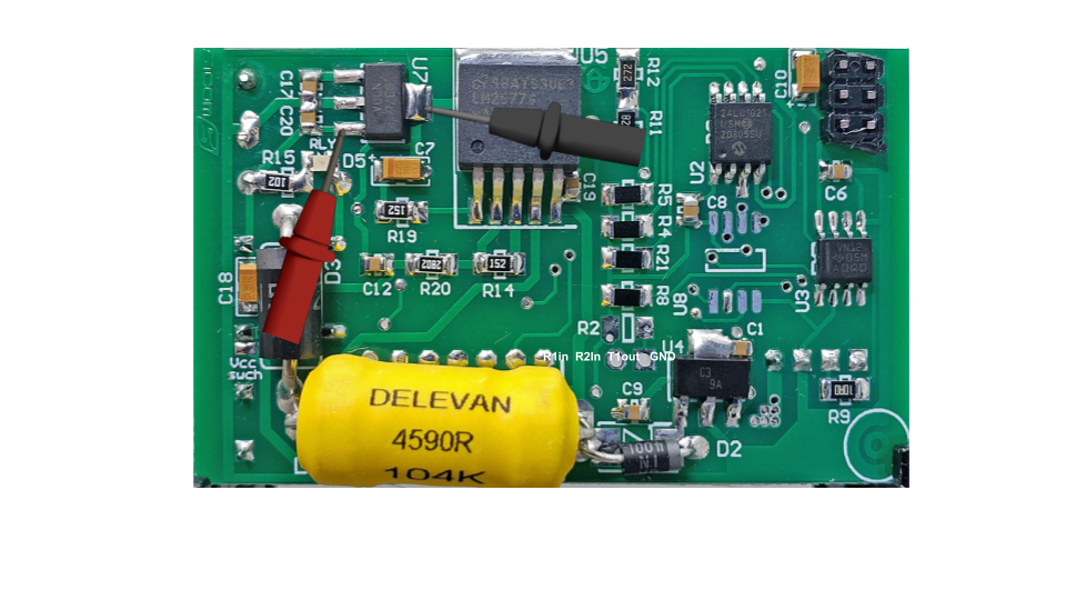 B) Se deberá medir el voltaje amplificado del módulo, en test point señado este voltaje permanece activo todo el tiempo sin necesidad de espera al relé, este voltaje al pasar por el relé obtiene un pequeña pérdida de voltaje.
