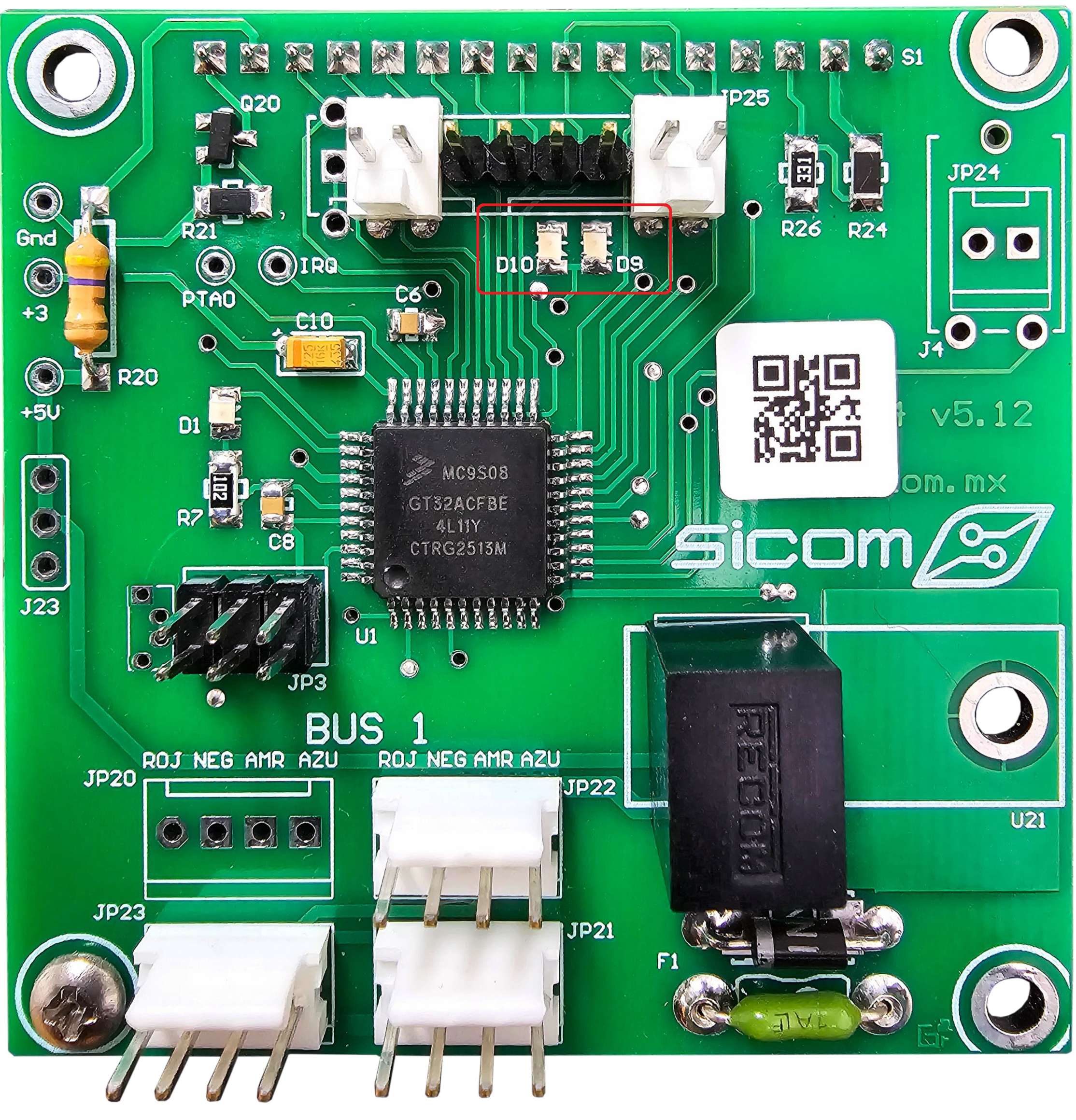 Estos dos LED indican que hay comunicación activa entre los módulos del equipo a través del canal principal (BUS 1). Lo normal es que estén parpadeando todo el tiempo. Si se observa que parpadean más rápido o de forma más intensa, probablemente el equipo esté realizando alguna tarea, como recibir configuraciones o intercambiar datos importantes entre módulos.