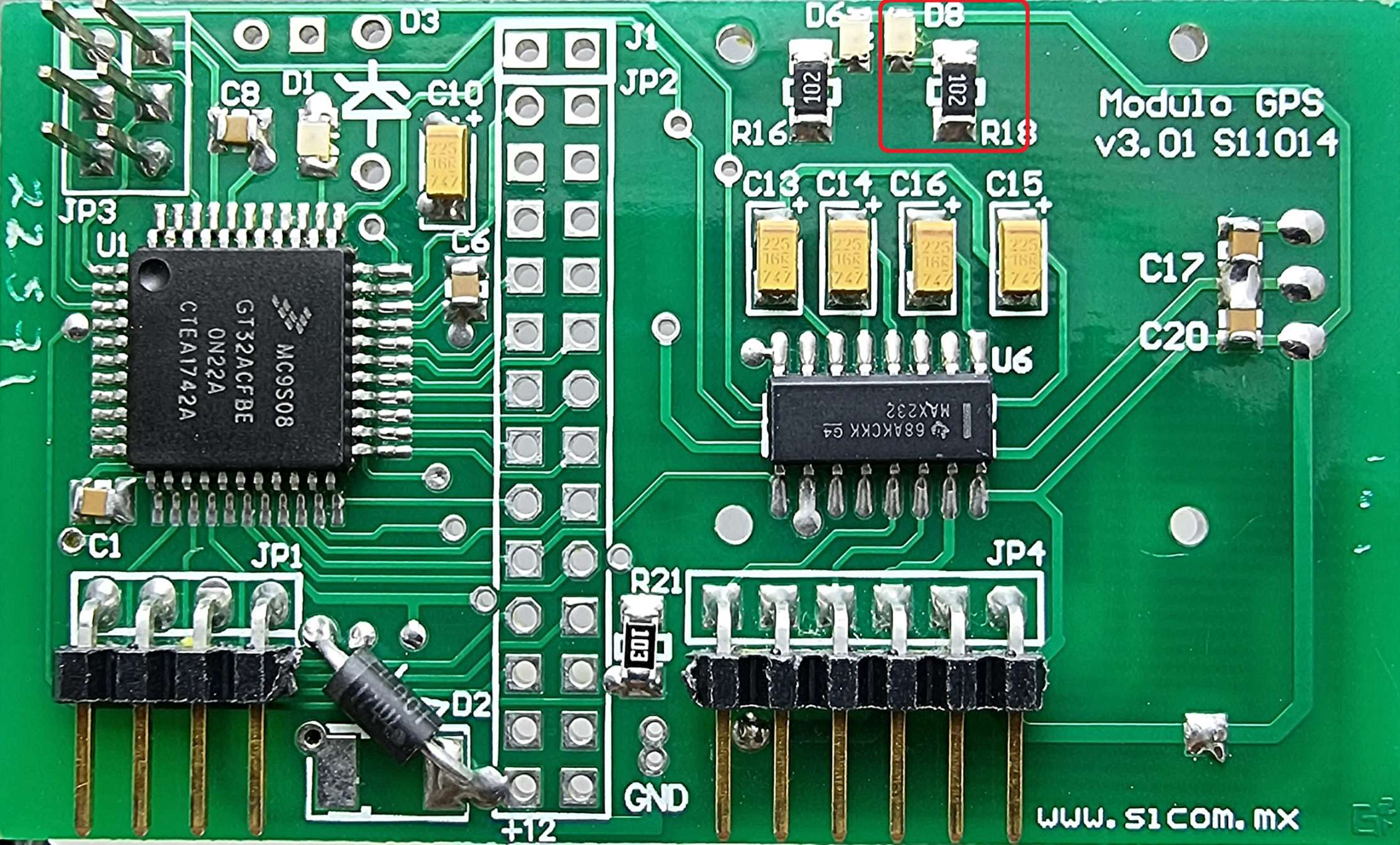 Si este led parpadea completamente seguido de una atenuación y no pasa a estar completamente apagado, significa que el módulo GPS no tiene comunicación con la antena GPS, en este momento el led D8 estará completamente apagado.