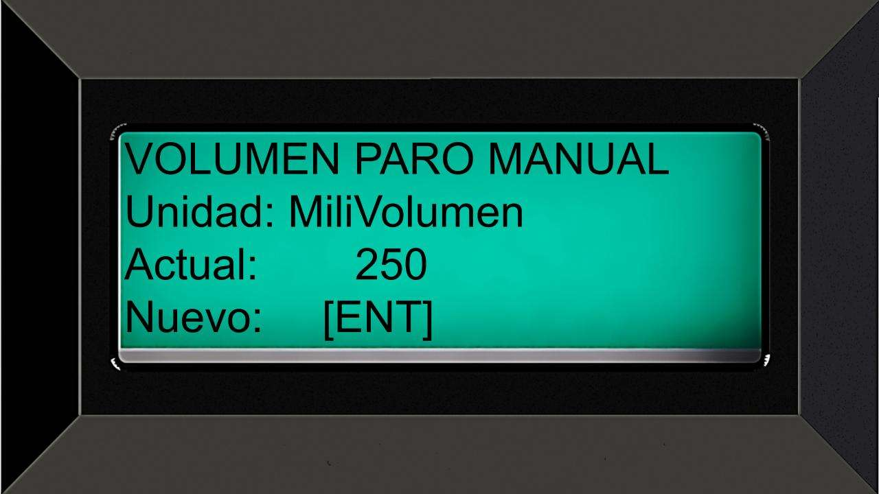 - Por defecto, el volumen de paro está configurado en 250 MiliVolumen, lo que equivale a 250 mililitros en calibración de litros.
