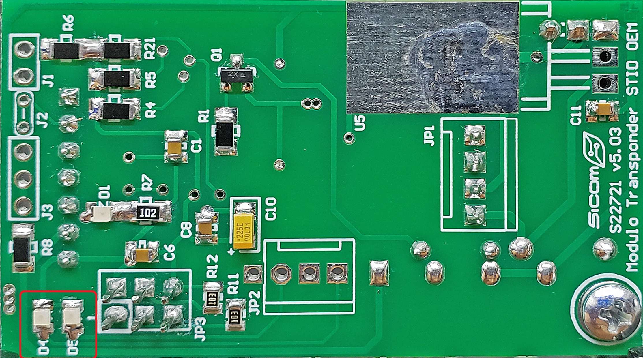 El led D4 permanece encendido cuando está activa la configuración “leer transponder” y led D5 parpadea 3 veces seguidas cuando nota la presencia de un tag sobre el módulo lector.