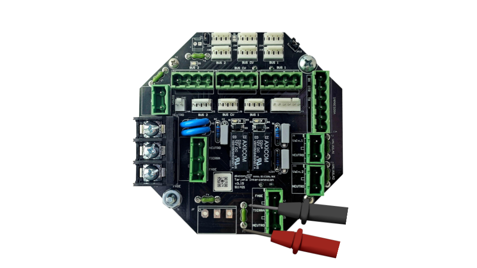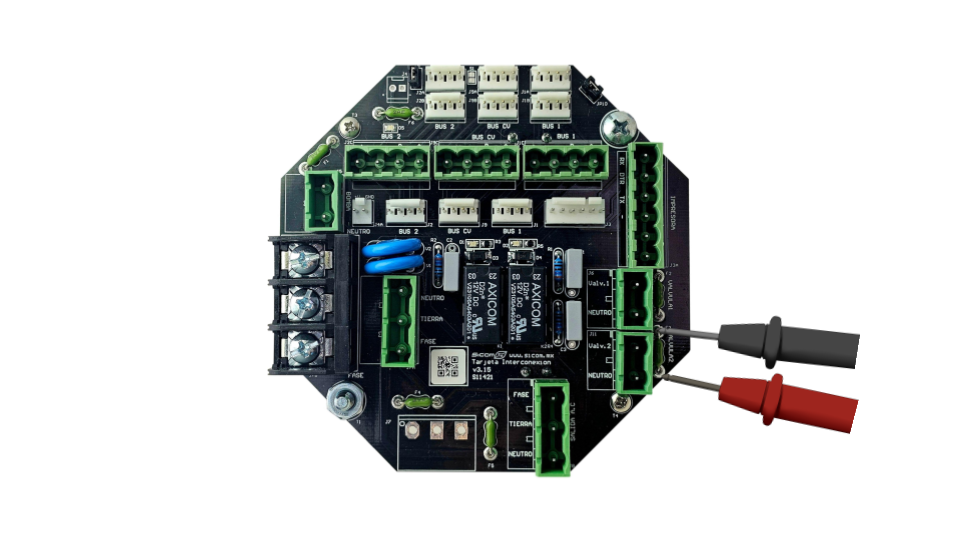 La salida de bomba es un contacto normalmente abierto, este no proporciona ningún voltaje, la señal de entrada será la de salida, para válvula 1 y válvula 2 se proporciona una señal de 127V al cierre del relé correspondiente.