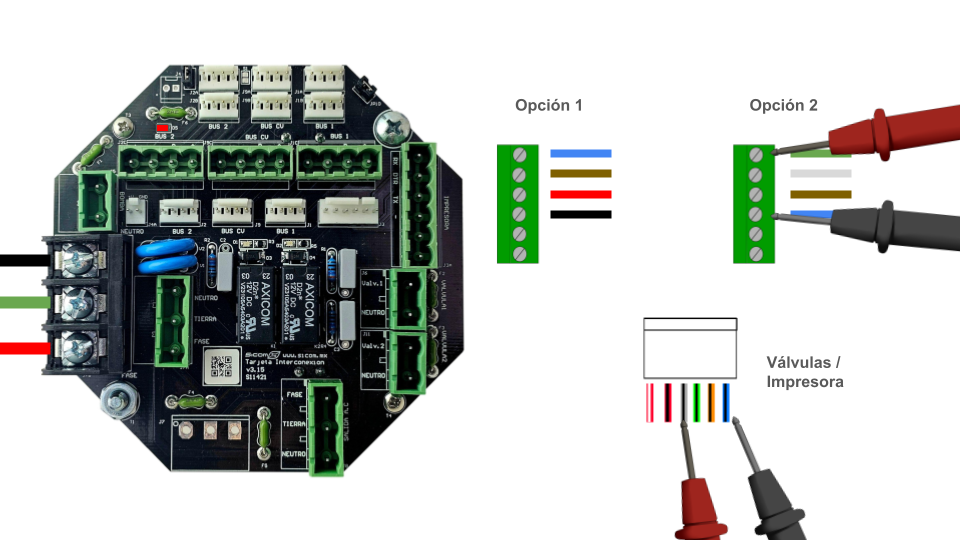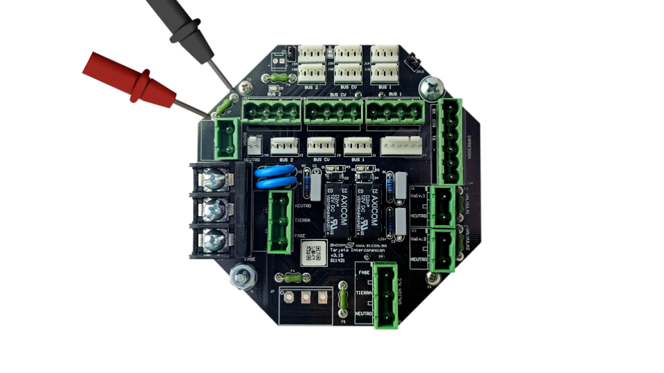 E) Revisar voltajes de Bomba, Válvula 1 y Válvula 2, esto se realizará iniciando un servicio desde el menú del equipo para que habiliten los actuadores. Al iniciar el servicio la válvula 1 y bomba actual con mismo relé, para la válvula 2 es un relé independiente.