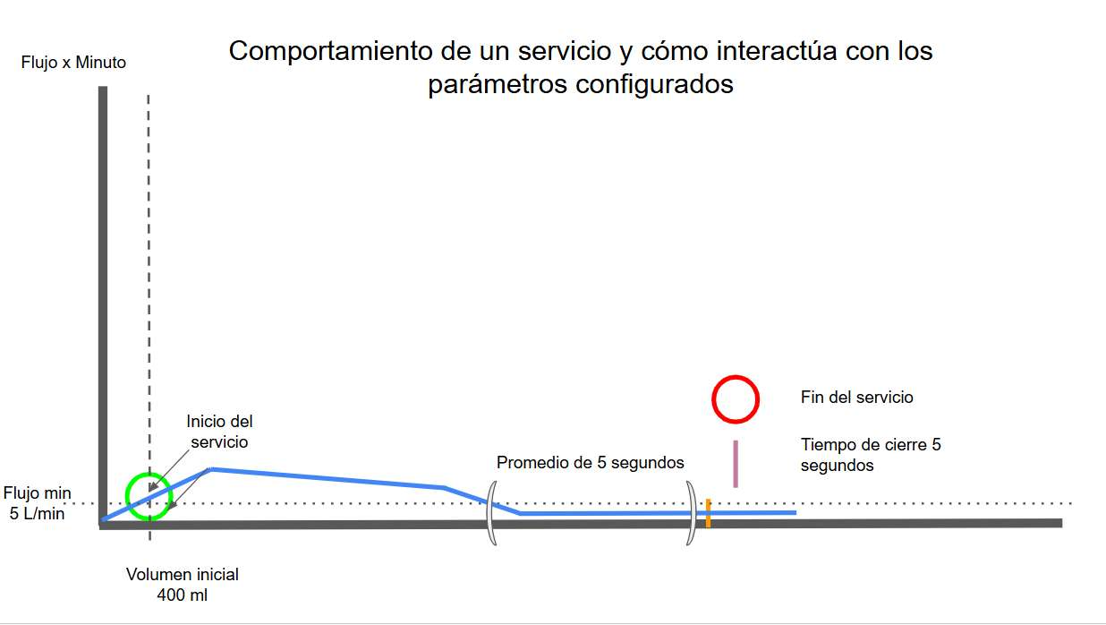 - Cualquier servicio con un promedio de flujo por minuto inferior a 5 L/min y que dure más de 5 segundos será cerrado bajo el evento: "Cierre por flujo mínimo".