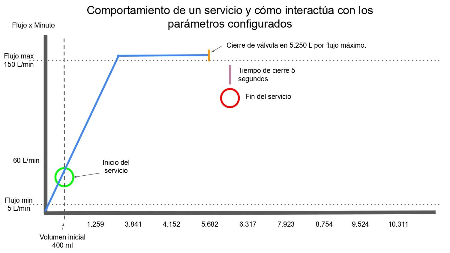- Cualquier servicio con un promedio de flujo por minuto superior a 150 L/min y que dure más de 5 segundos será cerrado bajo el evento: "Cierre por flujo máximo".