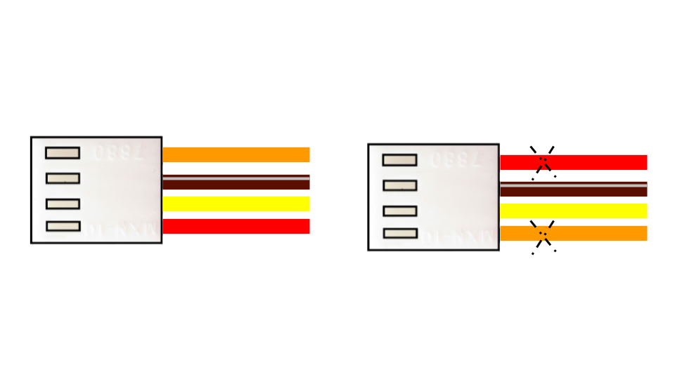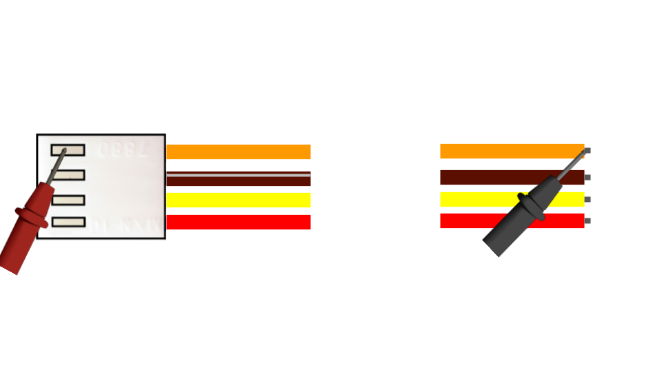 B) Corroborar la configuración y estado de los hilos en ambos extremos. En el ejemplo se colocan V+ y B en orden incorrecto, en esta revisión también se debe tomar en cuenta si los hilos están dañados o la conexión es deficiente al colocar el arnés en la terminal de módulo.