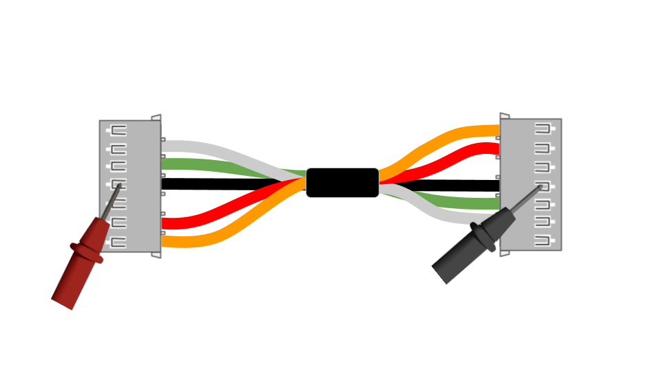 A) Medición de continuidad extremo a extremo con el uso de un multímetro en modalidad de continuidad.