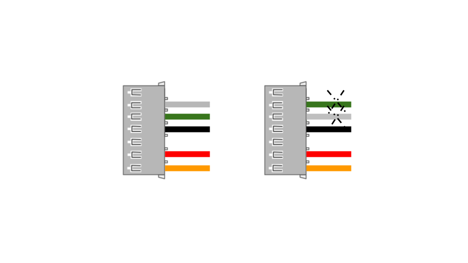 B) Corroborar la configuración y estado de los hilos en ambos extremos. En el ejemplo se colocan A y B en orden incorrecto, en esta revisión también se debe tomar en cuenta si los hilos están dañados o la conexión es deficiente al colocar el arnés en la terminal de módulo.