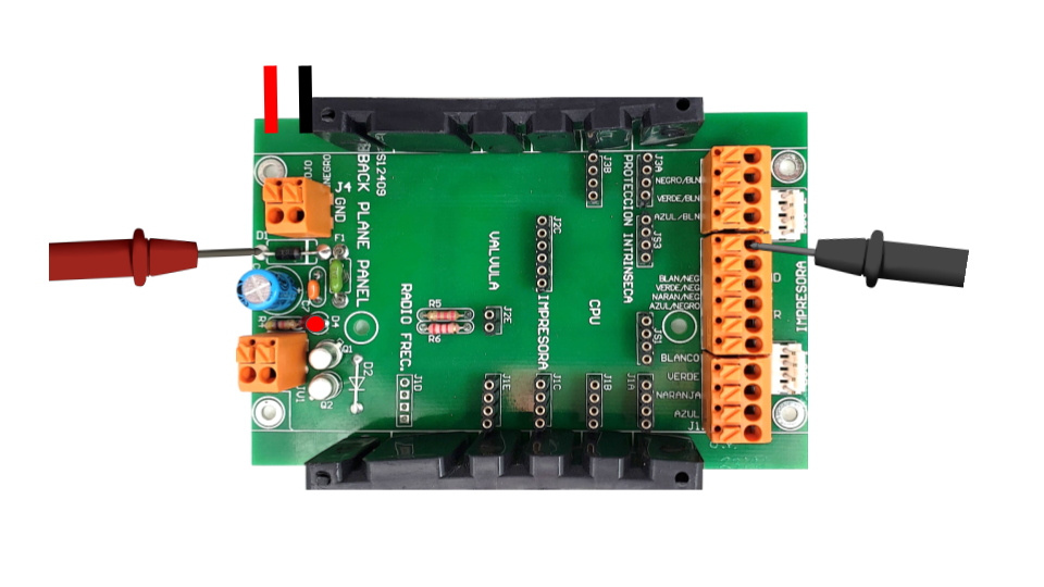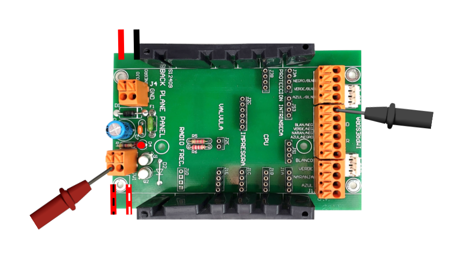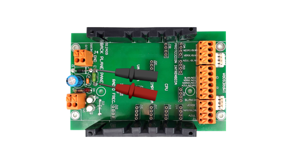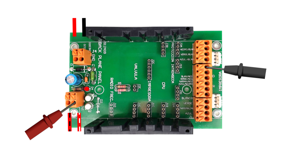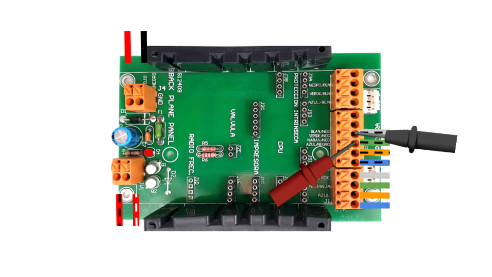 NOTAS: Para esta prueba se considera que el backplane carburacion tiene todos los módulos colocados en sus ranuras, por facilidad en la imagen no se colocan para dejar en claro los puntos de medición y que el cable 15H está conectado a una interconexión.