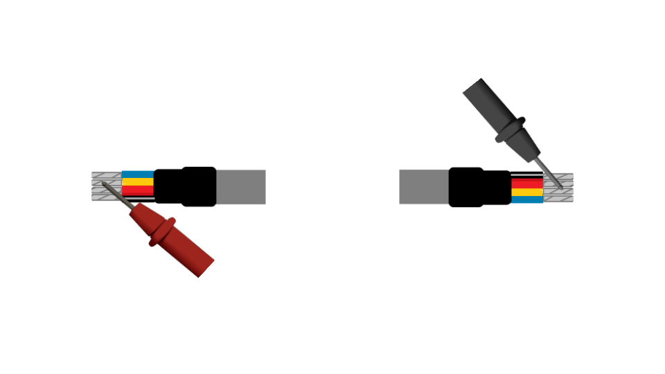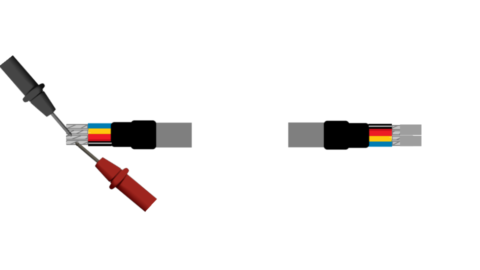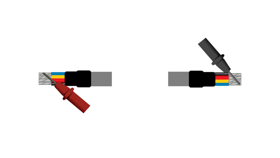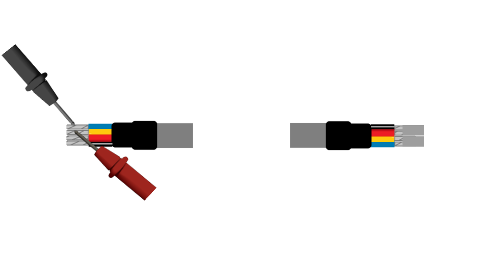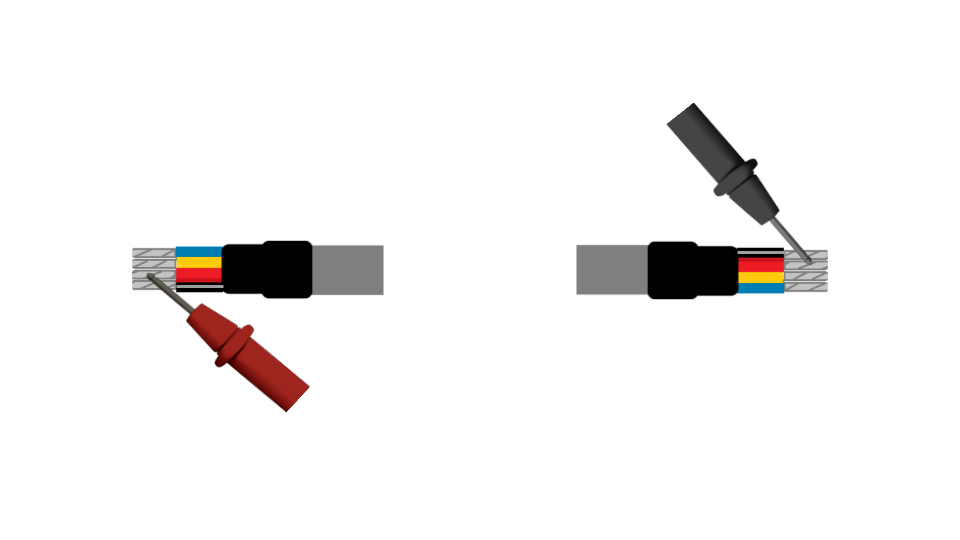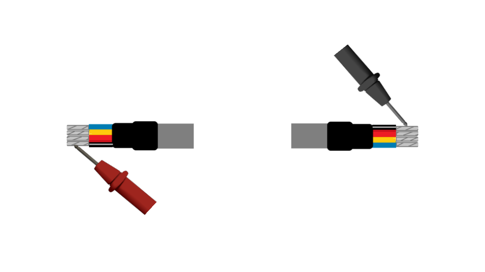 Si el cable aún no ha sido instalado en una tubería y se puede realizar la prueba de continuidad de punta a punta, colocando de ejemplo de un cable de 20 metros, realizaremos la medición de continuidad de los 4 hilos que utilizaremos (Rojo / Negro /Amarillo / Azul).