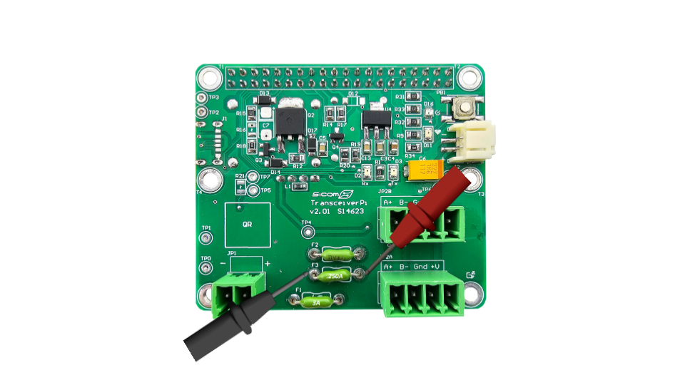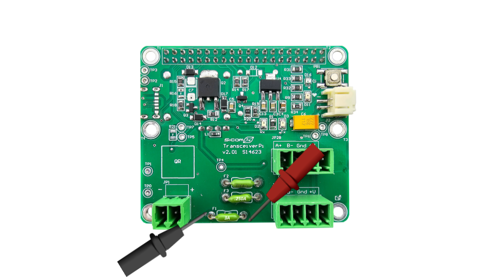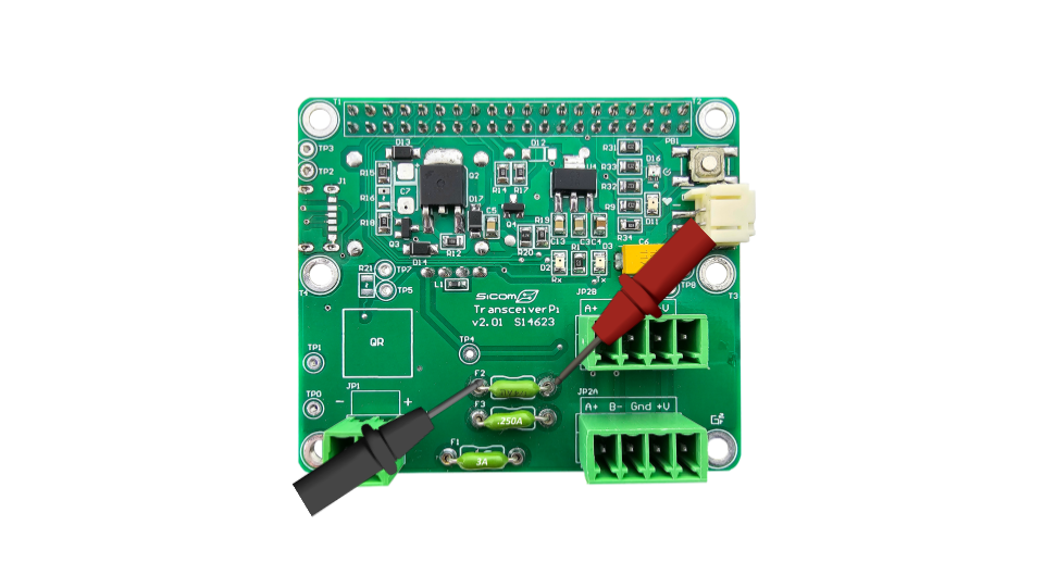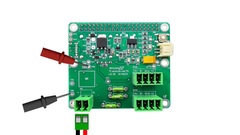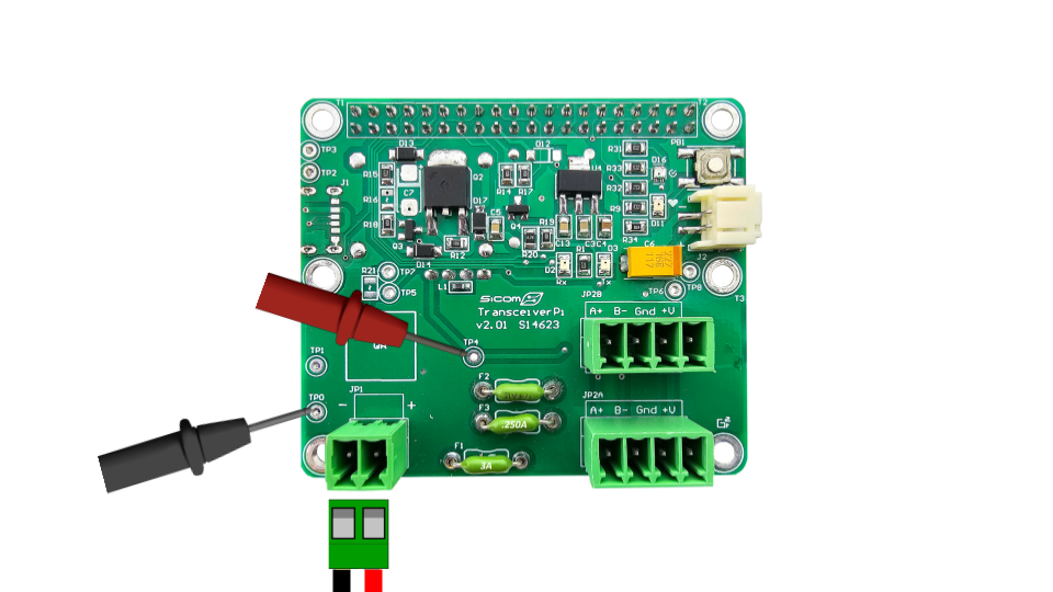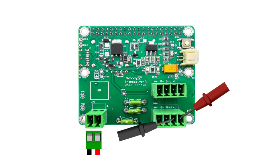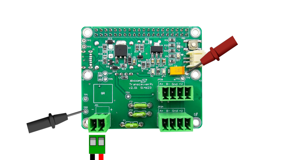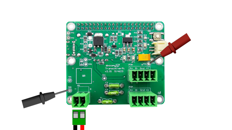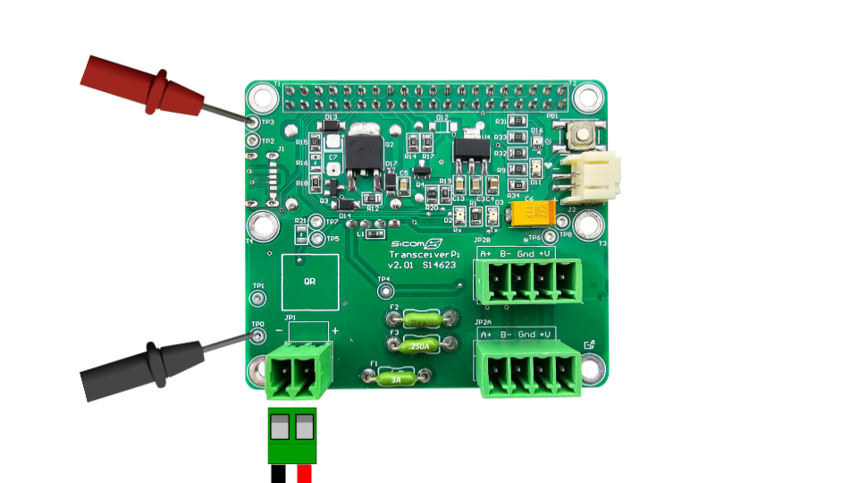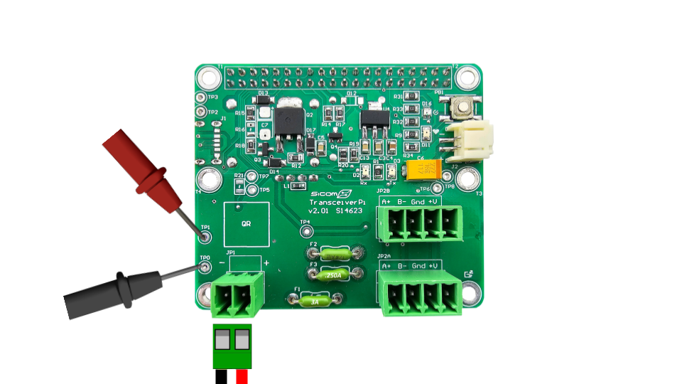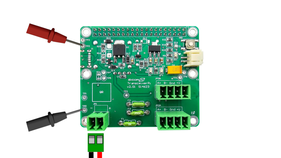 B) Se alimentará el Concentrador con una fuente de 12V en JP1 como se muestra en la imagen con un multímetro se deberá medir el voltaje con el que se estará alimentando, usando TP0 como punto de GND.