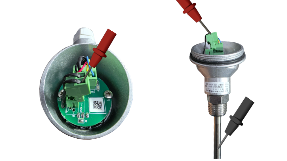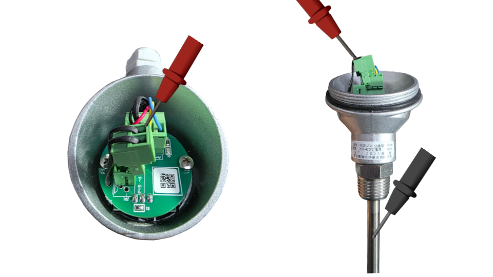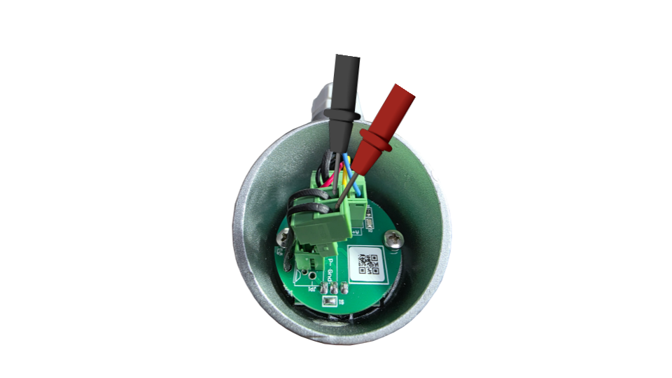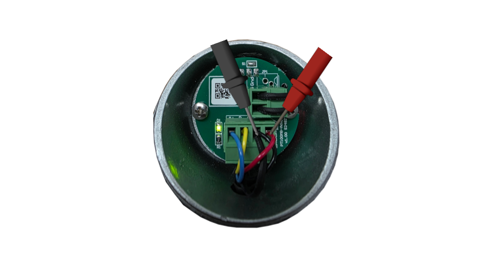 A) Medir la resistencia que entrega la sonda, esto se hace abriendo el cabezal del sensor de temperatura y desconectando el conector JP1, una vez desconectado con un multímetro en modalidad de lectura de resistencia, a temperatura de referencia de 25°C el sensor muestra una resistencia de aproximadamente 112 ohms.