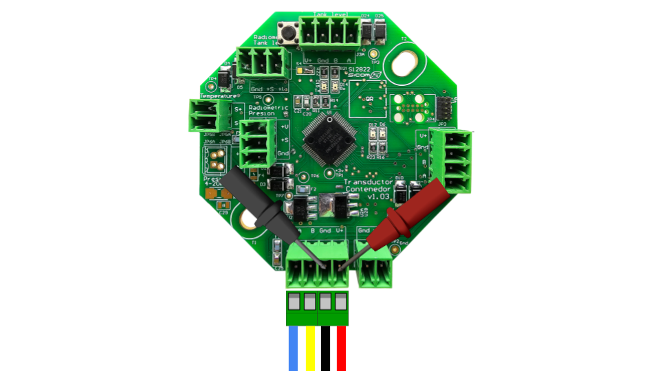 A) Medir con un multímetro en modalidad de medición voltaje el voltaje de alimentación del cable del sensor de nivel, ya que no es posible tomar alguna medida del módulo por la protección de la resina, esta medición se realizará sobre el extremo del cable que se conecta al transductor contenedor.
