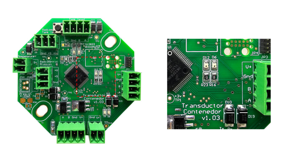 Al liberar el botón observe el módulo transductor contenedor, los leds D6 y D12 realizarán un gesto de parpadeo en secuencia entre ambos, este gesto se puede repetir cuantas veces se presione el push button del concentrador durante el tiempo que el transductor contenedor esté en modo paring.
