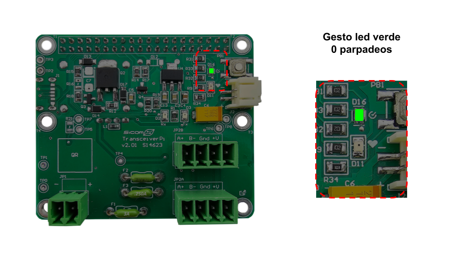 Sin parpadeo del led verde indicaría que el módulo está inicializado después de un borrado, no hay transductores enlazados.