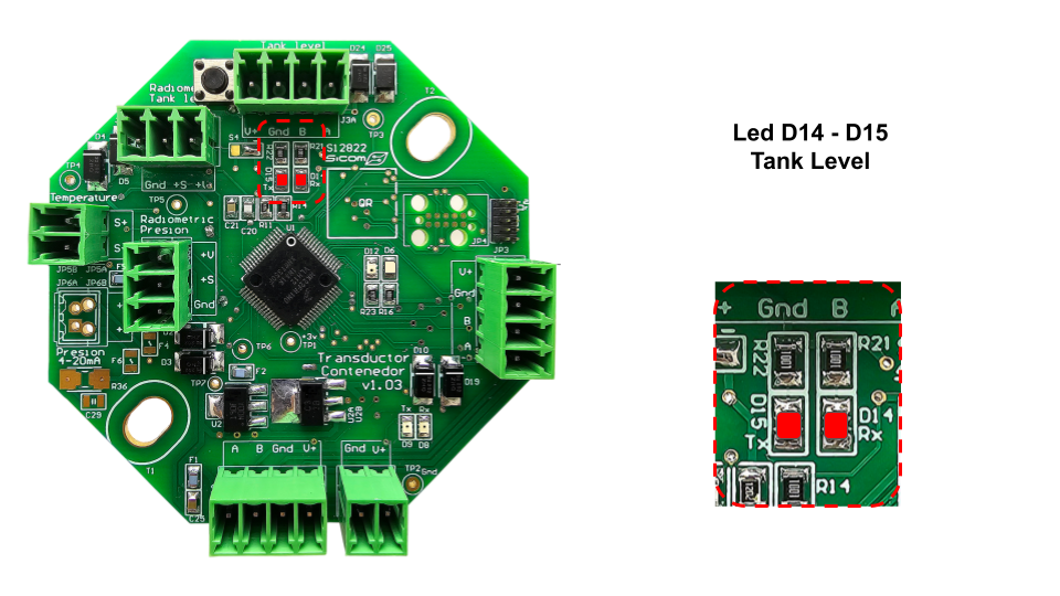 Los led's D14 - D15 nos indican el tráfico de información que lleva el bus del puerto tank level, este tráfico de información puede incluir las mediciones de sensor de temperatura cabeza marina y/o nivel magnético dial