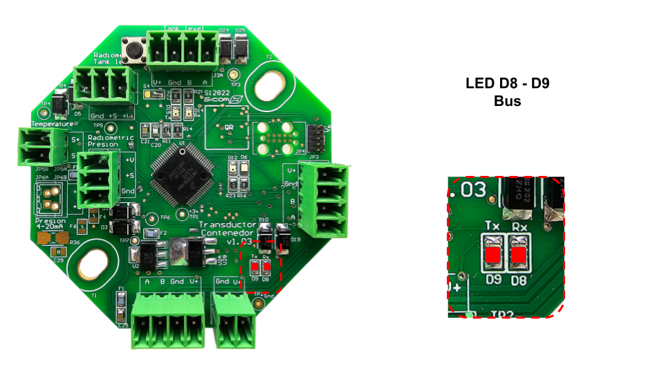 Los les D8 - D9 Bus Lemon nos indican el tráfico de información que lleva el puerto de bus, este tráfico de información puede incluir la comunicación entre transductores con el módulo concentrador para el envio de mediciones de nivel, temperatura y presión.